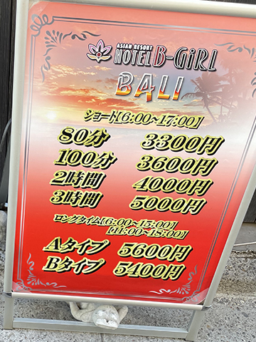 隣のB-Girl Baliが 80分 3300円だったので、マジで後悔です (こちらは、情報局だと3時間 4200円となってた)