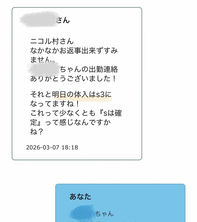 出勤のお知らせを見ると、確かにS3体入と!