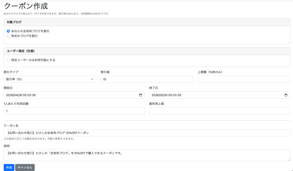 ブロガー様が発行するクーポン