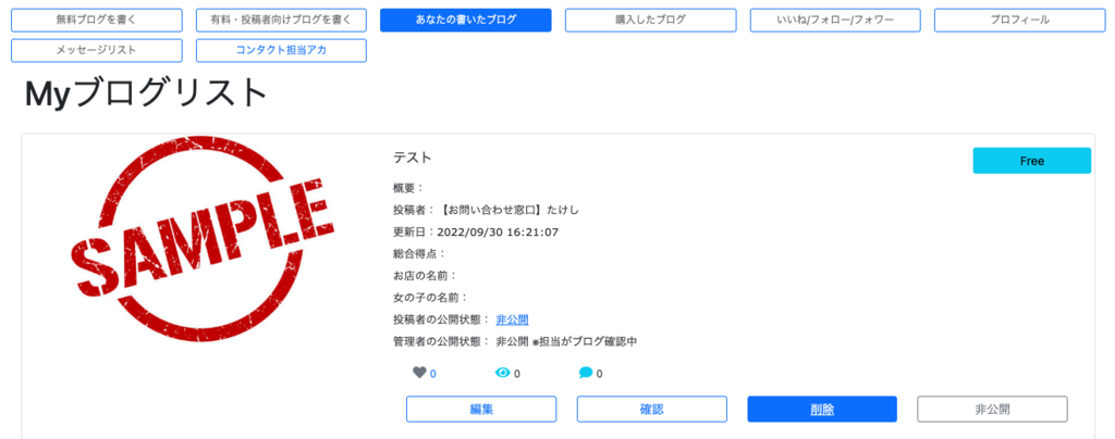 削除機能は「マイページ→あなたの書いたブログ→削除」で消すことができます。