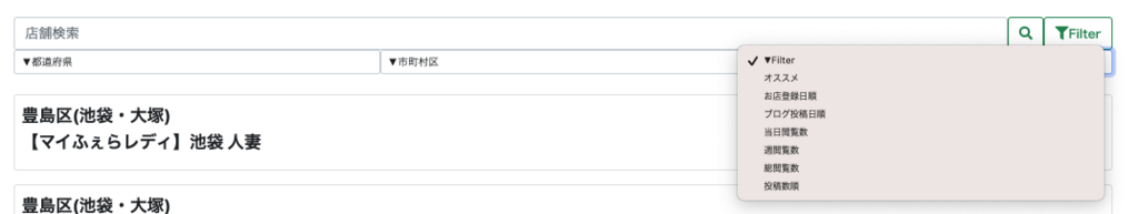 都道府県 市町村で絞れる機能を追加しており、店舗の並び順も ブログの投稿順 や 店舗のブログのPV数で並び替える機能を実装しております。