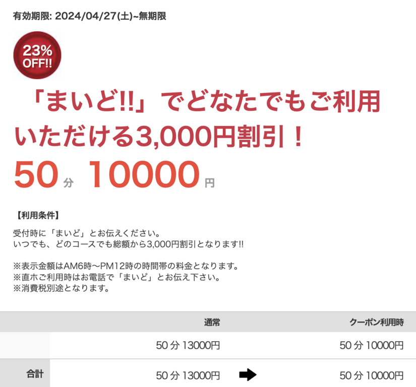 割引額は時期によってまちまちですが、24年9月現在は3000円引きのようです。