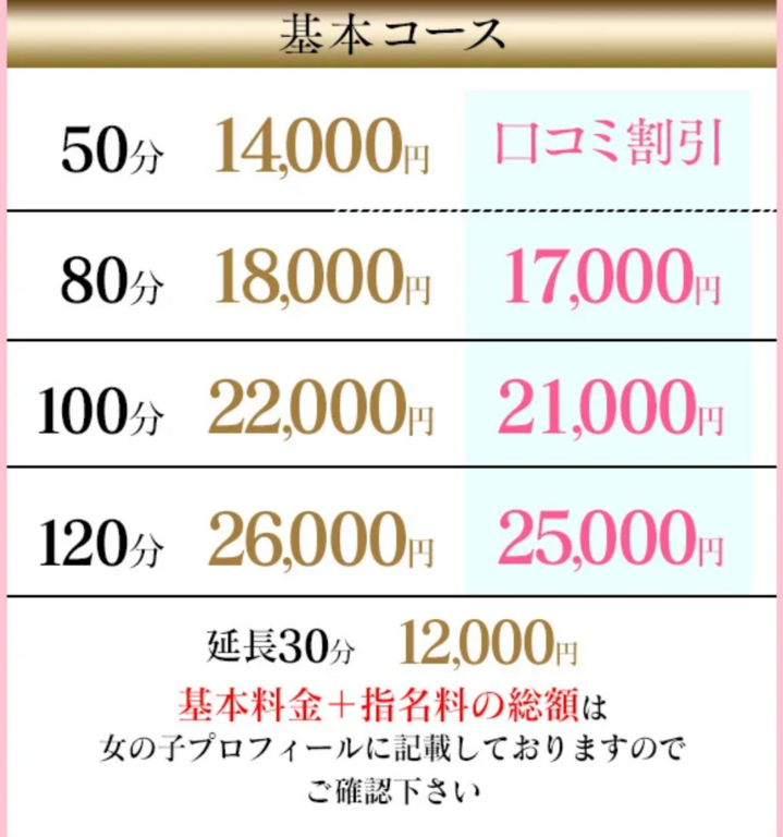 上記の基本料金+キャスト別料金の合計がプレイ代金となります。